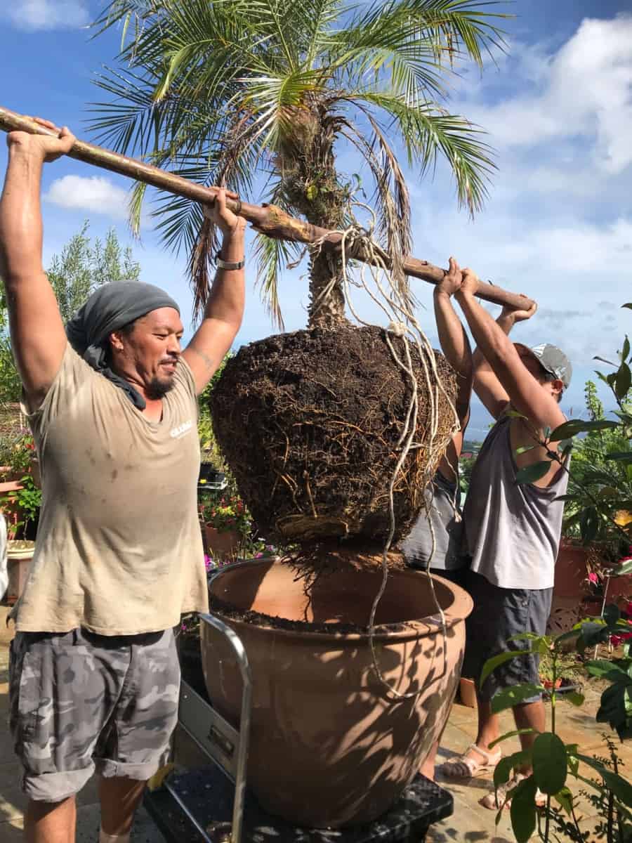 Palmen zijn prachtig. Maar ze vragen ook om hard werken. Zeker wanneer de grote bomen moeten worden verpot in grotere potten voor de verkoop aan – vooral – hotels op de Frans-Polynesische eilanden. Voor dat verpotten is veel spierkracht nodig. Voor het opkweken worden kleinere krachtpatsers gebruikt: de voedingsstoffen van Cellmax.